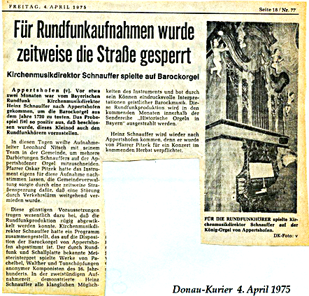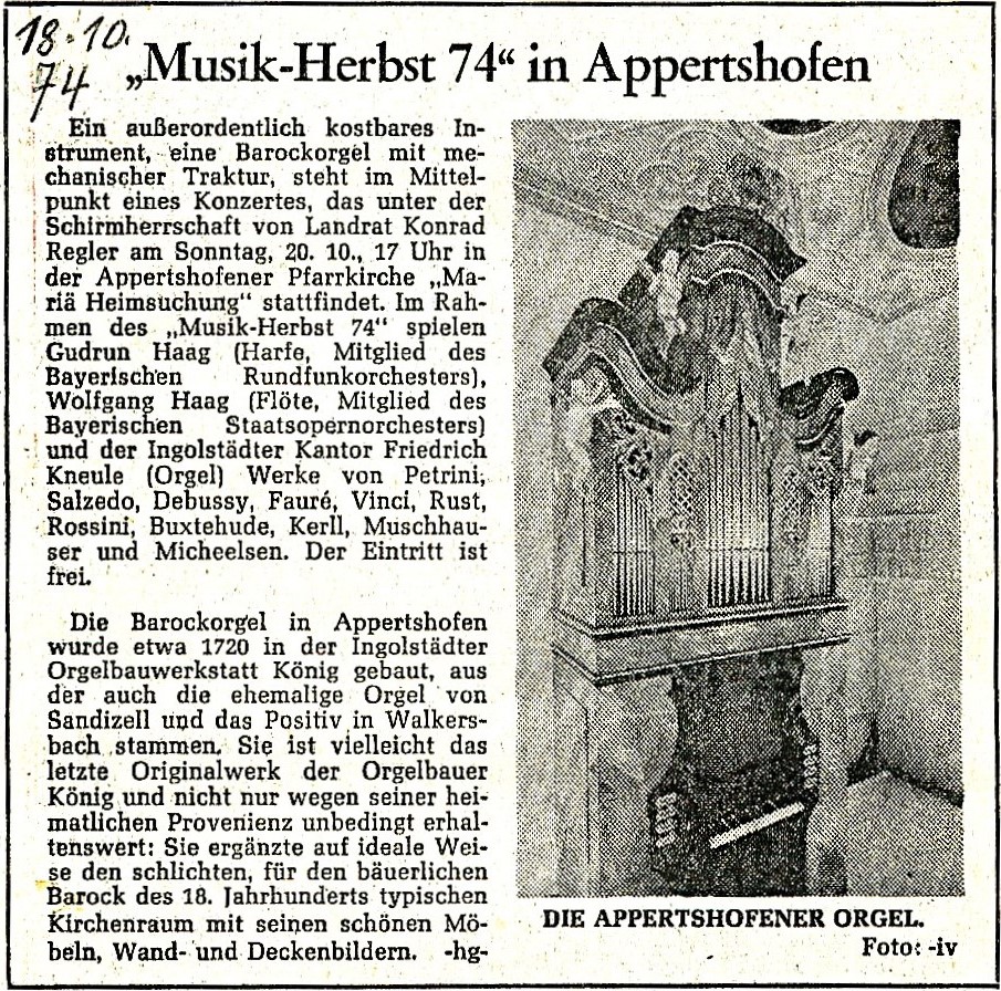 Caspar König. Sicherlich war es nicht das Glanzstück von Caspar König, aber sie gab den Anstoss für geistliche Kirchenkonzerte namhafter Interpreten in der Pfarrkirche von Appertshofen. Unter dem Titel „Musik-Herbst in Appertshofen“ waren die Konzerte unter Kennern weit über die Landkreisgrenze bekannt und sogar der Bayerische Rundfunk hat 1975 eine Sendung ausgestrahlt.